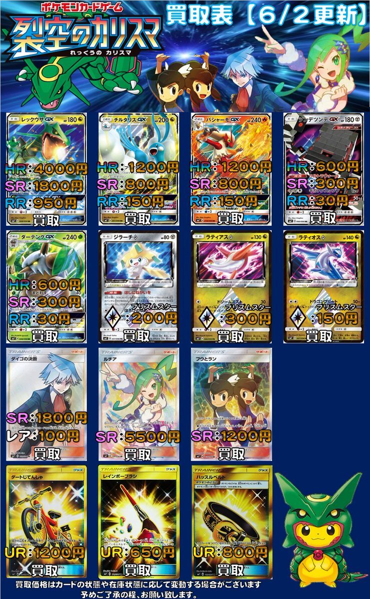 O Xrhsths カードラボ広島店 Sto Twitter ポケモンカードゲーム 最新弾 裂空のカリスマ の買取表作成しました レックウザgx Hr 2500 Sr 10 Rr 700円買取 Sr ダイゴの決断 00円買取 Sr ルチア 5000円買取 その他最新弾や過去弾も買取致します